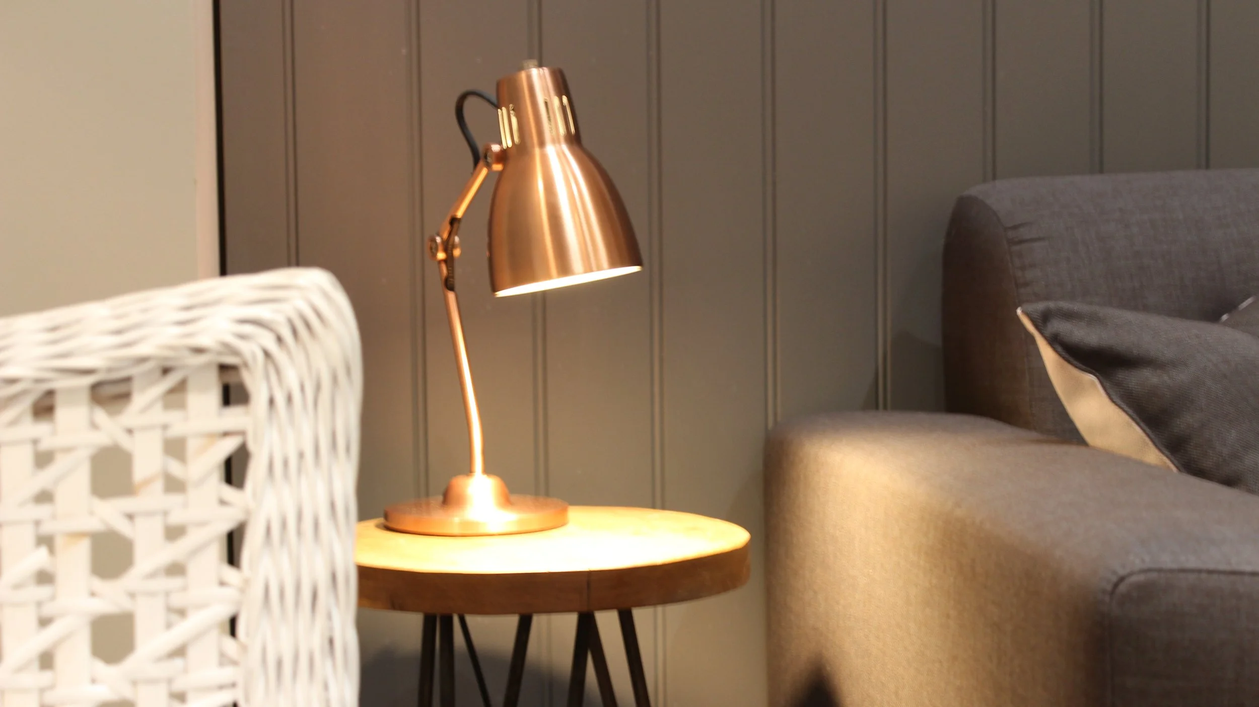 A copper-colored desk lamp illuminating a small round wooden side table in a cozy lounge with a gray sofa and a textured black pillow.